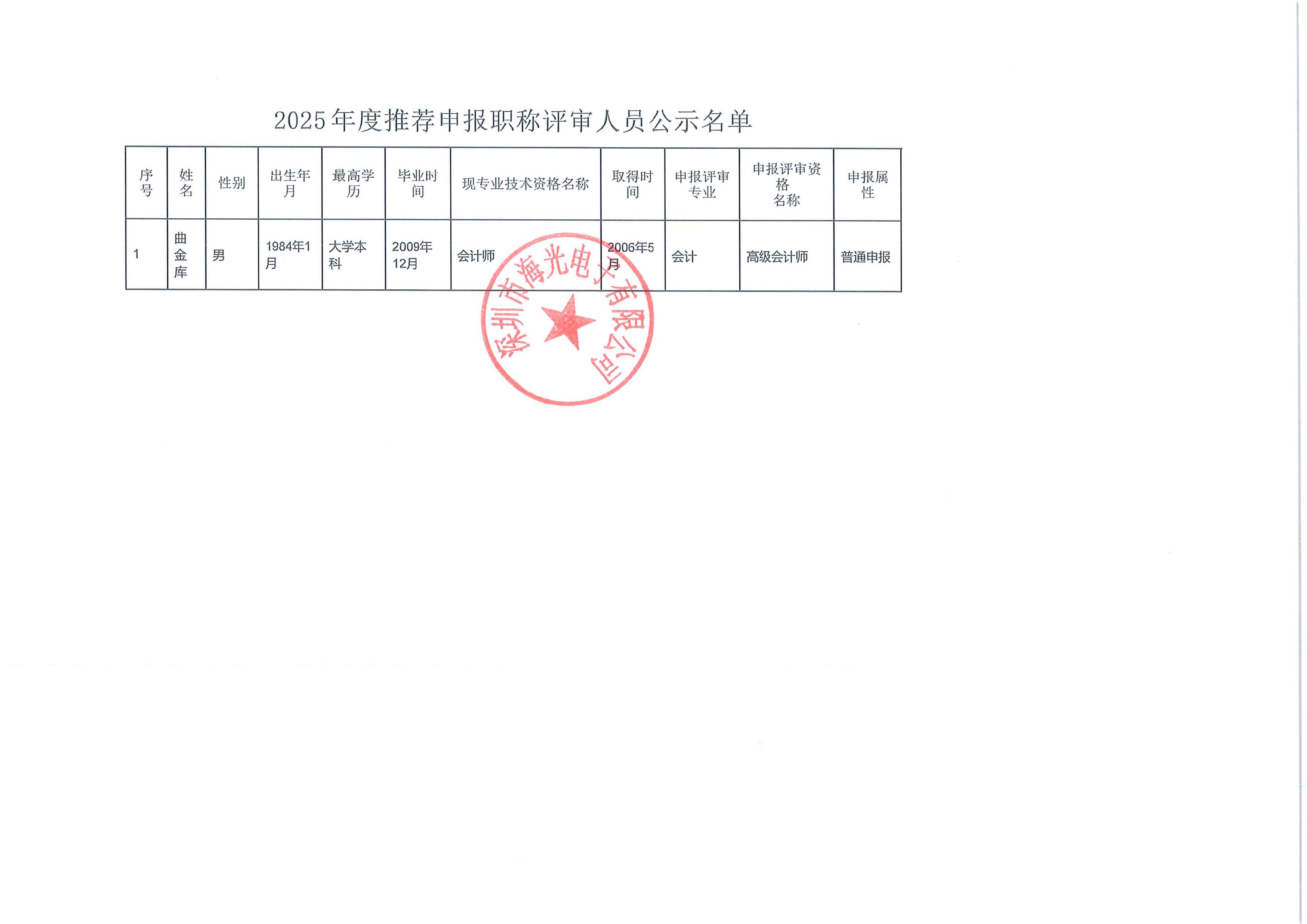 根據(jù)廣東省人力資源和社會保障廳 廣東省財政廳《關(guān)于印發(fā)廣東省會計人員職稱評價標(biāo)準(zhǔn)條件的通知》(粵人社規(guī)〔2025〕10號)、廣東省財政廳《關(guān)于開展2025年度高級、正高級會計師職稱評審工作的通知》(粵財會〔2025〕14號)和深圳市人力資源和社會保障局《關(guān)于做好我市2025年度職稱評審工作的通知》相關(guān)規(guī)定,結(jié)合實際情況,經(jīng)個人申報、單位審核,現(xiàn)將我單位推薦參加深圳市高級會計師職稱評審人員 曲金庫 的相關(guān)情況予以評前公示,接受全體職工及社會監(jiān)督。